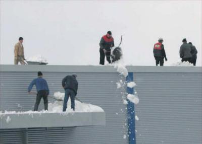 rechts, der eine Räumkolonne auf dem Dach des Neukaufs zeigt.