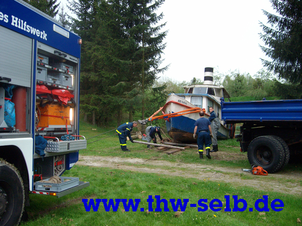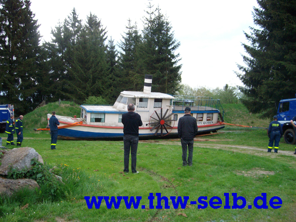 Der Mississippidampfer im Schönwalder Freizeitpark sollte aus dem Teich geborgen werden. Um ihn zwecks Renovierung an Land zu ziehen.Das 15t schwere (17m lange, 3m breite und 5m hohe) Schiff wurde mit Greifzug, Hebekissen und Seilwinde aus dem Wasser befördert. Das war mal eine ganz andere Aufgabe für meine „Jungs“. Da kann man mal sehen, dass das THW auf jedem Gebiet einsatzbereit ist. So die Worte des Ortsbeauftragten Uwe Prucker. Der Einsatz verlief reibungslos und ohne Komplikationen und dauerte fünf Stunden.