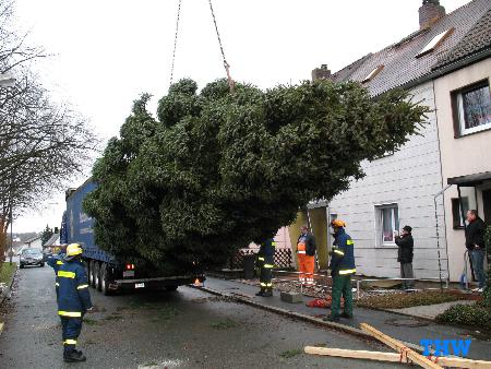 Meter hoher Weihnachtsbaum, mit Hilfe eines Mobilkrans, sanft von seinem