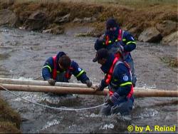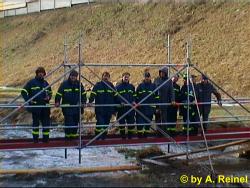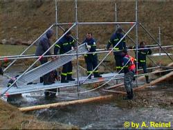 So wurde beschlossen als erstes eine Brücke zu bauen. Nach einer Generalprobe in der Halle wurde als Übungsplatz der Selbbach neben der Autobahn bei Unterweissenbach ausgewählt. Dort war der Bach aufgrund der Schneeschmelze auf ca. 9 m Breite angewachsen, so daß es genau die richtige Übungssituation war.