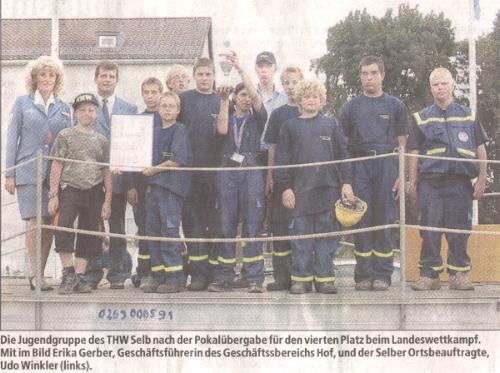 Nach der Übergabe von acht neuen Jugendgruppenfahrzeugen für bayerische Ortsverbände fand endlich die Siegerehrung statt. Der jüngste Selber Teilnehmer, Stefan Prucker (elf Jahre), und Tanja Dollinger bekamen den Pokal für den vierten Platz und eine Urkunde überreicht. Zur Pokalübergabe war der Parlamentarische Staatssekretär im Bundesinnenministerium, Rudolph Körper, mit einem Hubschrauber aus Berlin angereist.