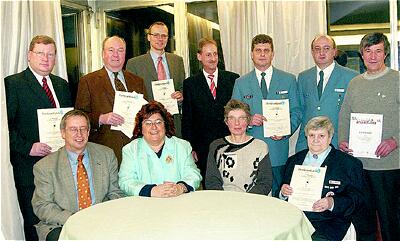 Djuro Dobrijevic (stehend, rechts) und sein Helfer- und Sponsorenteam: (stehend, von links) Werner Gebhardt (Vishay), Horst Rausch (Rausch&Pausch), Bernd Drechsel (Textilveredelung Drechsel), Stadtsportverbands-Vorsitzender Dr. Klaus von Stetten, Udo Winkler, Uwe Prucker (beide THW) sowie sitzend von links) TS-Vorsitzender Werner Kraus, stellvertretende Stadtsportverbands-Vorsitzende Dorothea Schmid, Djuros Ehefrau Kvetuse und Erika Werner (BRK).