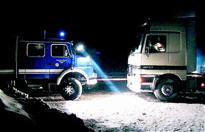 Am vergangenen Freitag in den Abendstunden wurde der Ortsverband Selb des Technischen Hilfswerks (THW) von der Verkehrspolizei Hof zur Unterstützung auf der A93 angefordert. Dort waren auf Grund der starken Schneefälle zahlreiche Lkw an den Steigungen liegen geblieben. Diese wurden mit drei Gerätewagen mit Schneeketten aus den Gefahrenbereichen geschleppt. Der Einsatz dauerte bis 1 Uhr. Neben dem THW Selb waren noch weitere Ortsverbände des Geschäftsführerbereiches Hof auf den Autobahnen im Einsatz. Ebenfalls am Freitag wurde das Selber THW von der Grenzpolizei Selb zur Bergung eines ungarischen Lkw angefordert. Bei einem missglückten Wendemanöver auf der B15 hatte sich der Lastwagen im Schnee festgefahren und blockierte die gesamte Fahrbahn. Das Foto zeigt die Bergung des LKW auf der B15.