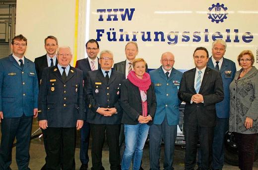 Bei der Fahrzeugübergabe zeigt das Bild (von links) den Geschäftsführer des THW Hof, Rüdiger Maetzig, den Selber Oberbürgermeister Uli Pötsch, Kreisbrandrat Gerhard Bergmann, MdL Martin Schöffel, Stadtbrandinspektor Max Schmidt, Landrat Dr. Karl Döhler, MdB Elisabeth Scharfenberg, THW-Ortsbeauftragten Uwe Prucker, Innenminister Dr. Hans-Peter Friedrich, THW-Präsident Albrecht Broemme und Bundestagsabgeordnete Petra Ernstberger. |