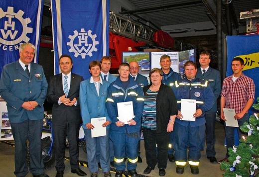 Auch Ehrungen gab es anlässlich der 60-Jahr-Feier des Selber THW. Das Bild zeigt (von links): THW-Präsident Albrecht Broemme, Innenminister Dr. Hans-Peter Friedrich, Nadja Schaufuß, Klaus Prucker, Beatrix Schäfer, Ortsbeauftrager Uwe Prucker, Anita Hartmann, Gerhard Lüftner, Tobias Strake, den Hofer THW-Geschäftsführer Rüdiger Maetzig und Felix Künzel. |