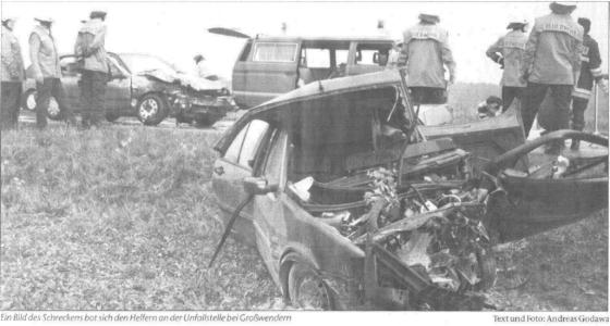 GROSSWENDERN. - Vier Verletzte forderte ein Unfall am Sonntag nachmittag kurz nach 15 Uhr auf der Staatsstraße 2179 zwischen Spielberg und Großwendern. Ein Mann aus Marktleuthen war mit Frau und fünfjährigem Kind in seinem Wagen von Großwendern kommend aus ungeklärter Ursache nach rechts auf das Bankett geraten. Bei dem Versuch gegenzulenken, geriet der Wagen auf die linke Spur und prallte frontal mit einem entgegenkommenden Auto zusammen, das von einer 43-jährigen Frau gesteuert wurde. Bei dem Aufprall wurde die Fahrerin in ihrem Wagen eingeklemmt und mußte von dem Technischem Hilfswerk und der Feuerwehr mit der Rettungsschere befreit werden. Die Frau, die ebenfalls aus Marktleuthen stammt, wurde mit dem Rettungshubschrauber in das Bayreuther Klinikum geflogen. Der Unfallverursacher und seine Familie wurden in das Selber Krankenhaus gebracht. Text und Foto: Andreas Godawa Frankenpost, 26.Mai 1998 |