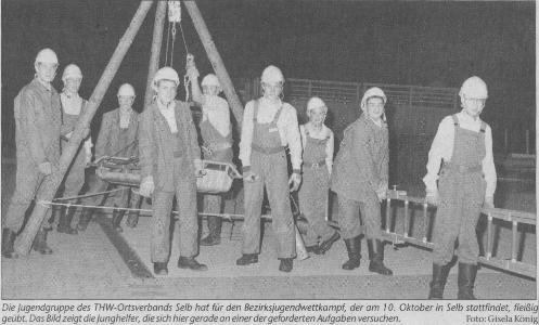 Die Jugendlichen treffen sich - wenn nicht gerade für einen Wettkampf trainiert wird - im l4tägigen Rhythmus in der THW-Unterkunft, wo sie von Uwe Prucker und, weiteren Helfern ausgebildet werden. Auch wenn es Geduld, Mühe und oft Nerven erfordert, macht den Selber THWlern die Arbeit mit den Jugendlichen viel Spaß, zumal auf diese Weise das Nachwuchsproblem, unter dem so mancher Ortsverbant leidet, in den Griff zu bekommen ist.