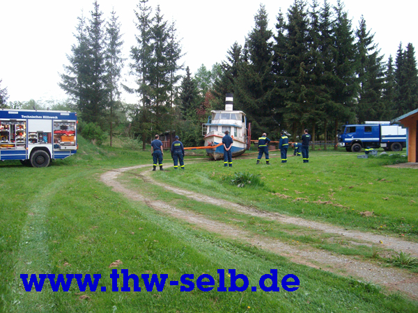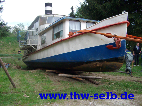 Der Mississippidampfer im Schönwalder Freizeitpark sollte aus dem Teich geborgen werden. Um ihn zwecks Renovierung an Land zu ziehen.Das 15t schwere (17m lange, 3m breite und 5m hohe) Schiff wurde mit Greifzug, Hebekissen und Seilwinde aus dem Wasser befördert. Das war mal eine ganz andere Aufgabe für meine „Jungs“. Da kann man mal sehen, dass das THW auf jedem Gebiet einsatzbereit ist. So die Worte des Ortsbeauftragten Uwe Prucker. Der Einsatz verlief reibungslos und ohne Komplikationen und dauerte fünf Stunden.