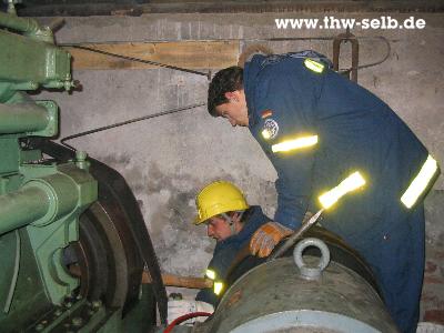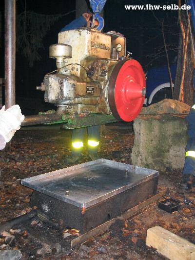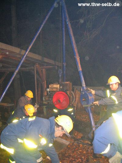 Am Donnerstag 20.11.2003 fand die Ausbildung im Schausteinburch an der Häuselloh statt. Dort wurden zwei stationäre Motoren mit Hilfe von einem Dreibock mit Seilwinde und mit der Hydropresse angehoben. Dabei wurden dann auch noch jeweils eine Ölauffangwanne unter den Motoren angebraucht, um in Zukunft Öl aus den Motoren aufzufangen, da der mit Wasser gefüllte Steinbruch selbst ein Biotop ist.
